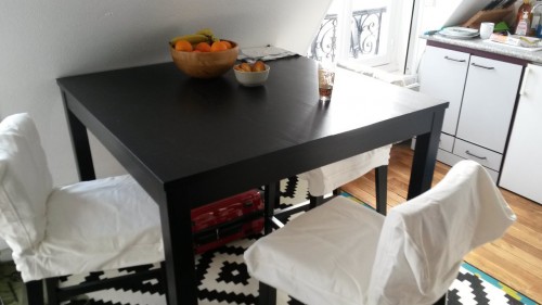 Gestern hat sich endlich mal wieder die Gelegenheit ergeben mit Piotr (meinem polnischen Kollegen) IKEA heimzusuchen. Jeder von uns brauchte noch das eine oder andere, ich unter Anderem meine Stühle. Und erstaunlicherweise habe ich die diesmal auch tatsächlich bekommen! Nach nur 3 1/2 Monaten und ~5 Besuchen! Einen Teppich habe ich auch noch mitgenommen und eine Obstschale. Ich hab mal alles auf ein Bild gepackt: